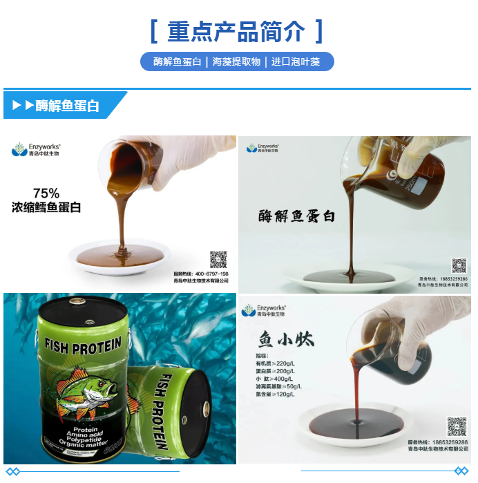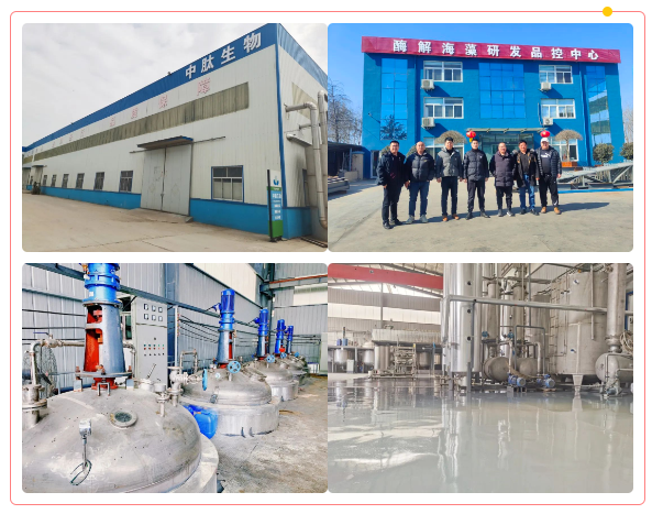 青岛中肽坐落美丽的海滨城市青岛市胶州市,生产基地占地50亩。公司拥有先进的低温酶解技术、产能充沛的智能化专业生产线,以及丰富的海内外特肥原料资源,是一家专业从事海藻、鱼蛋白等海洋生物产品研发、生产、加工的技术创新型企业。产能充沛年产一万吨海藻提取液、3000吨酶解海藻冻干粉、海藻精,5000吨酶解鱼蛋白。致力于成为广大新型肥料生产企业、特肥贸易商提供高品质、性价比高的功能性成品级特肥原料供应商。