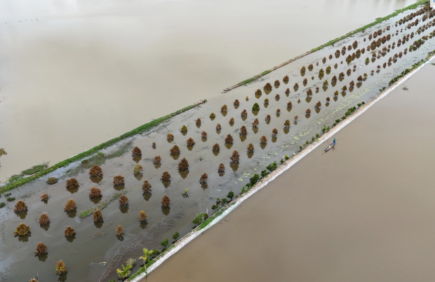 西宁省农业与环境厅数据显示,河道水位日均上涨3-5厘米,部分点位较2024年洪峰高出32厘米。T1运河水位已高出田面近2米,多处堤防与水面持平,溃坝风险持续加剧。农业厅副厅长丁氏芳庆(音译)指出,潮汛与洪水叠加使灾情雪上加霜。