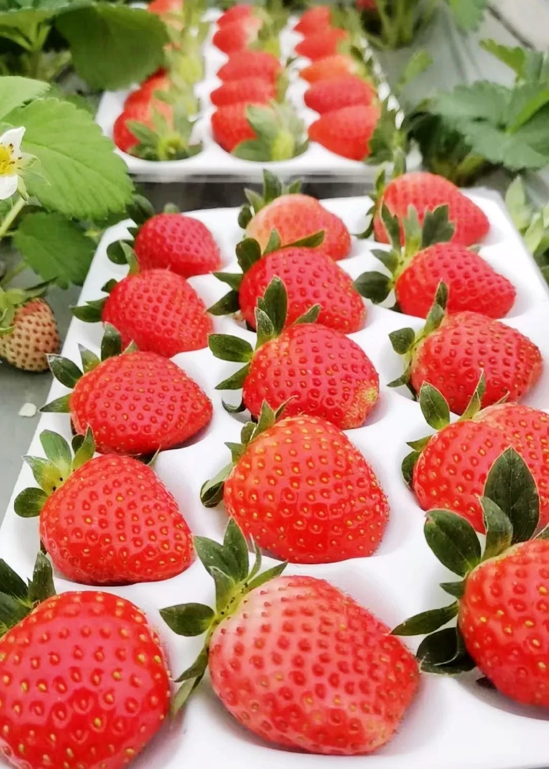 今年草莓上市的时间比较早,我们前两天就开始采了。虽然上市的早,但因为光照好,所以草莓的品相、口感都比往年要好。