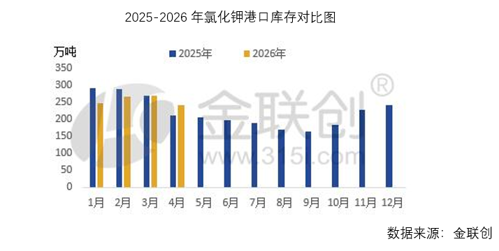 截至2026年4月中旬,国内主要港口氯化钾库存约230万吨,相较于2025年同期190万吨小幅回升,但整体依旧处在历史低位区间,远低于行业合理安全库存水平。连续两年四月份港口库存同步偏低,表面走势趋同,背后驱动逻辑却截然不同,充分体现出国内供需格局、全球供应链及市场调控的阶段性变化。