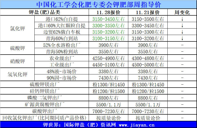 跌:港口62%白钾3150-3450元/吨左右,低端是指导价、货源少,因为货少,所以高端报价只是小落;港口60%大红颗粒3300-3350元/吨左右,低端为指导价,高端跌价速度较快,又即将“并轨”;边贸62%白钾3150-3200元/吨左右,低端是指导价,高端跌价较快,这主要与大型进口商增加了放货量有关;青海60%粉晶官方到站价3100元/吨维稳,市场流通3150元/吨左右,因为进口钾跌价所以高端价格有所回落。