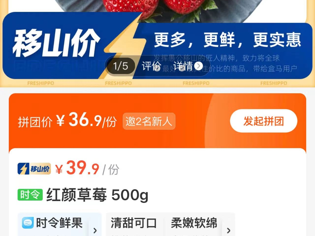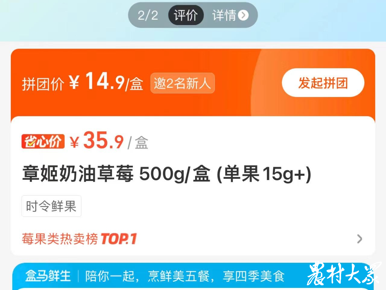 “盒马”App中,章姬奶油草莓的价格为35.9元/斤,拼团价为14.9元/斤。