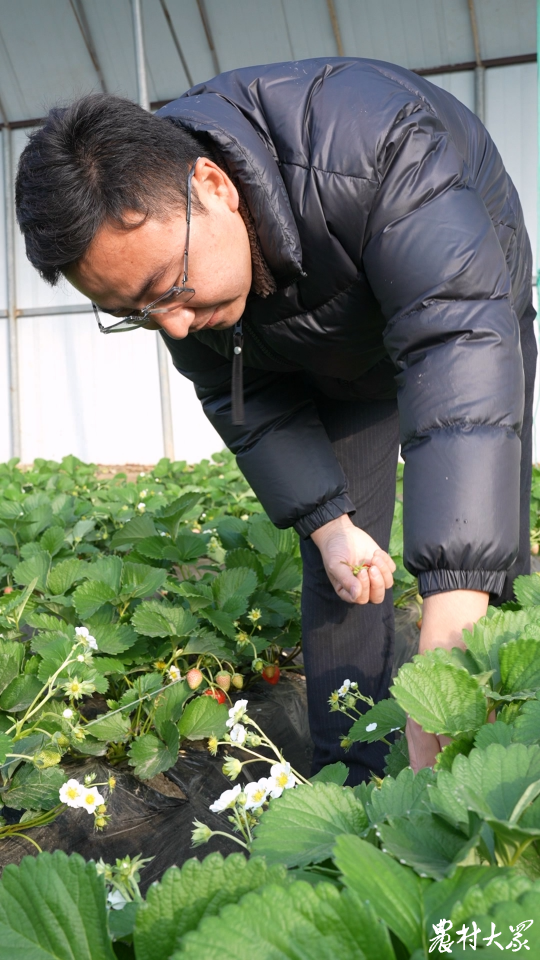 曹县好滋甜农业科技发展有限公司农场经理周鹤飞在采摘园里查看草莓情况。