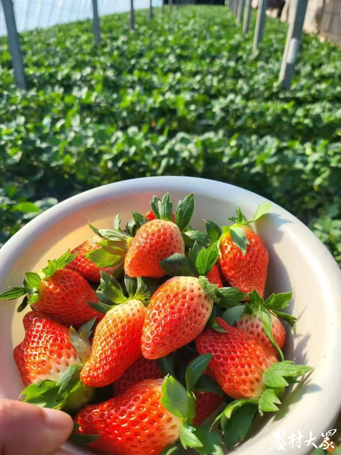 淄博市沂源县中庄镇盖冶村草莓种植户杜鹏从大棚中摘下来的草莓。