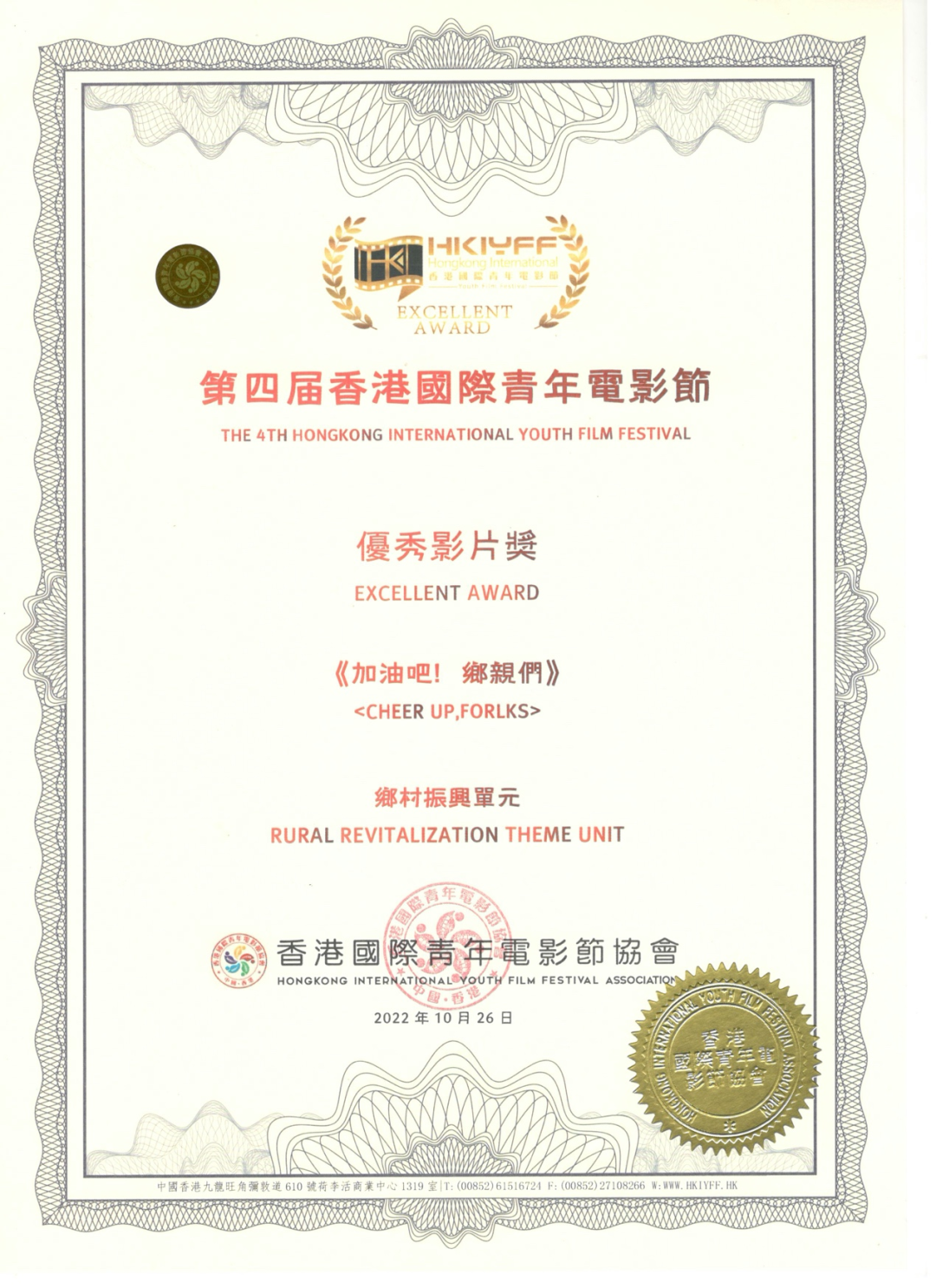 《加油吧!乡亲们》荣获第四届香港国际青年电影节优秀影片奖