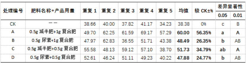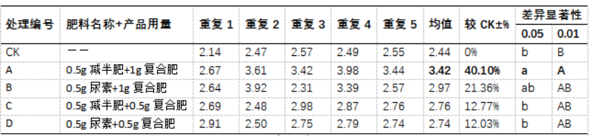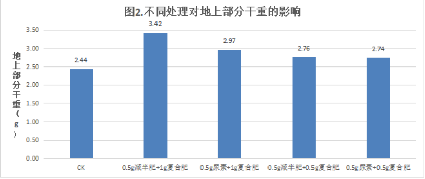 (2)在同等复合肥用量前提下,处理A鲜重比处理B(0.5g尿素+1g复合肥)增加了23.74%,差异达到了显著水平,处理C鲜重比处理D(0.5g尿素+0.5g复合肥)增加了8.03%。表明γ-氨基丁酸显著提高了氮肥利用率。