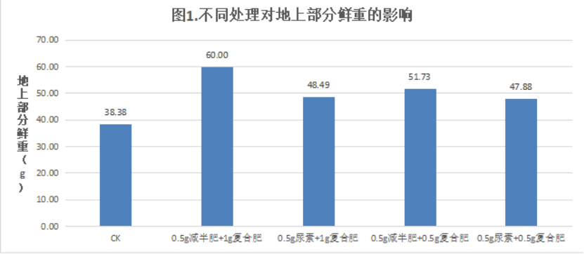 (1)处理A(0.5g减半肥+1g复合肥)、处理C(0.5g减半肥+0.5g复合肥)处理地上部分鲜重较CK分别提高了56.35%和34.79%,差异均达到了极显著水平。