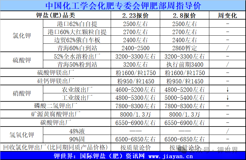 氯化钾本周氯化钾价格十分稳定。港口62%白钾主流报价2500元/吨左右,边贸62%白钾主流报价2400元/吨左右,国产钾在等待盐湖月底结算,价格暂不明朗。货源总体充足,盐湖继续生产但尚未恢复满开,其余青海厂家仍处于检修期;港口到货继续,边贸和中欧班列持续少量到货。需求有所向好,节后市场询单显著增加,据了解下游复合肥走货有所加快,部分农业市场需求正初步启动。目前氯化钾看稳情绪占主导,看空情绪有所弱化