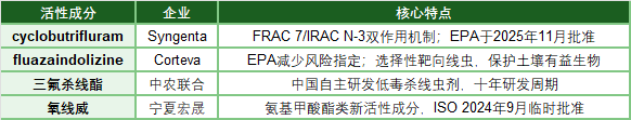 新登记的化学活性成分普遍强调低毒、选择性、环境友好特征,而非更高的杀灭效率。Corteva的fluazaindolizine获得EPA减少风险指定,TYMIRIUM技术强调保护土壤有益生物——这反映了监管压力下化学创新的方向性转变。