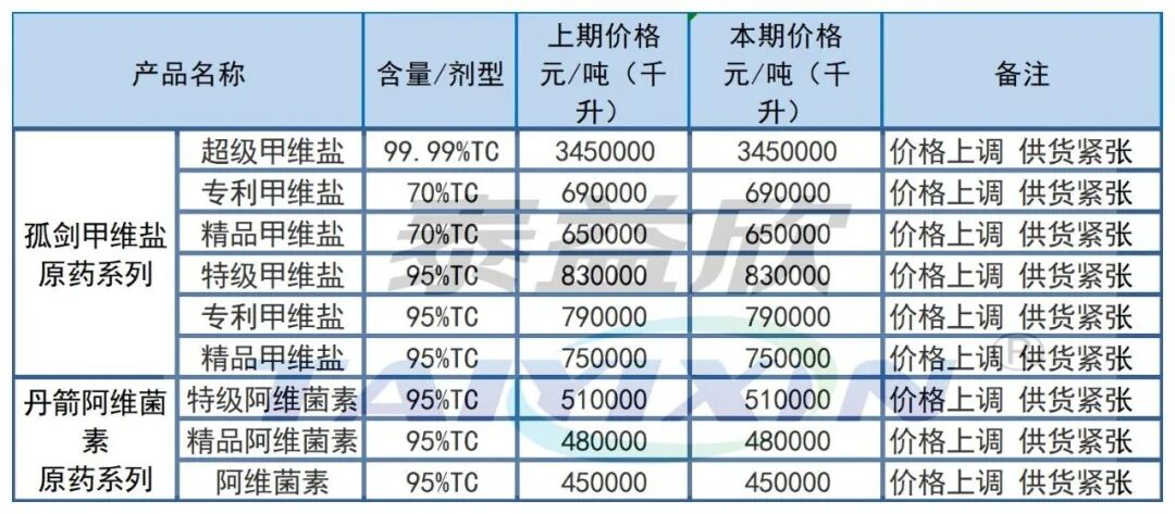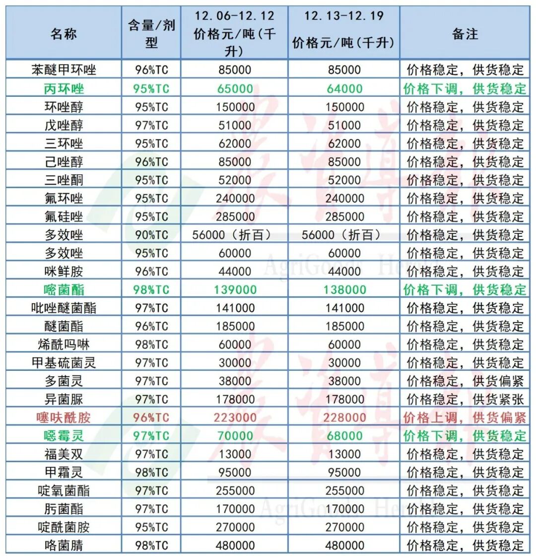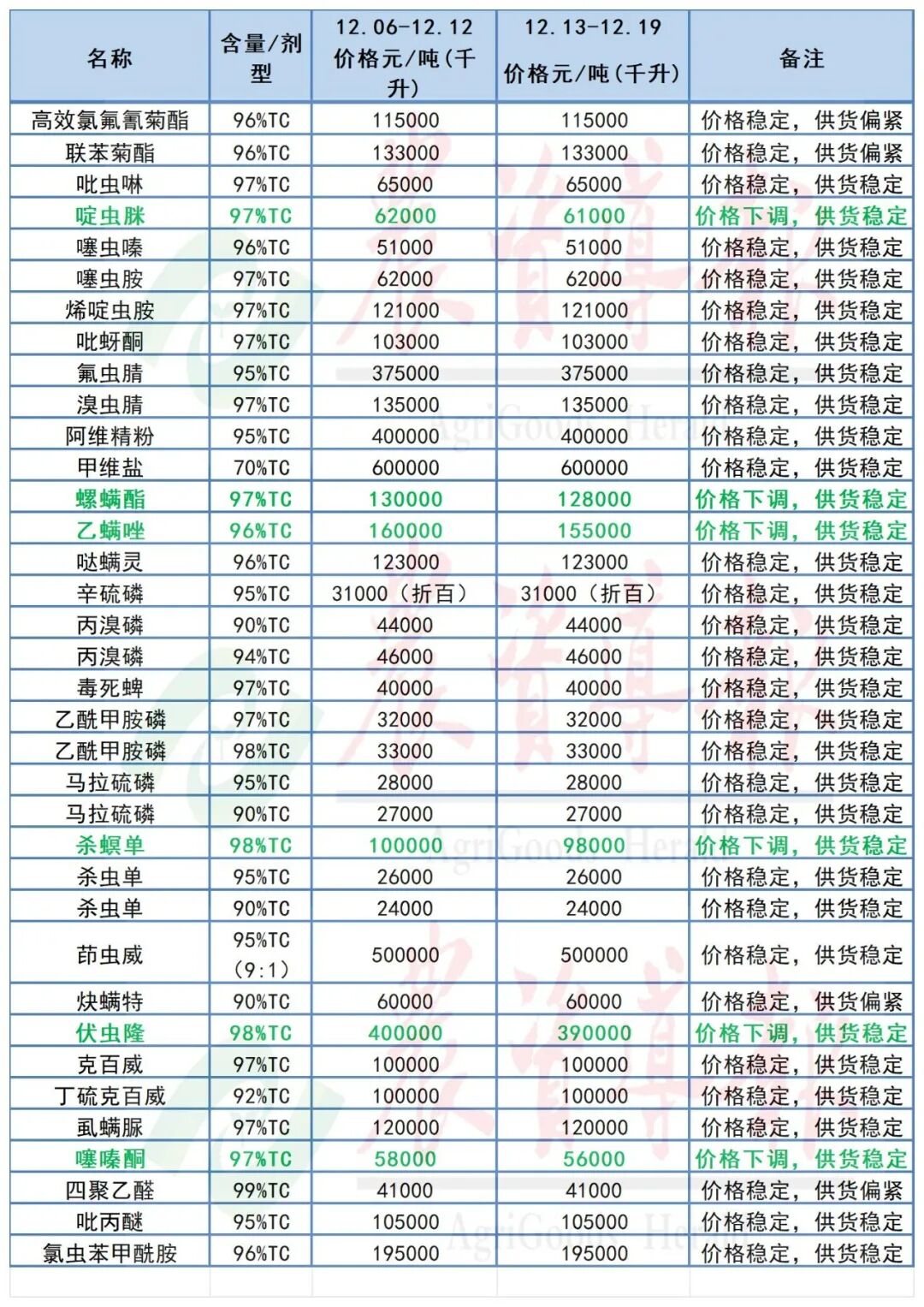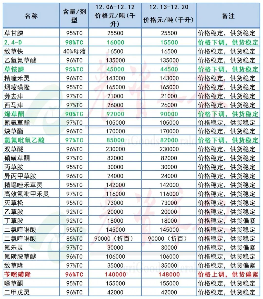 苄嘧磺隆、噻呋酰胺原药价格上涨!2,4-D、草铵膦、烯草酮、啶虫脒等13个原药价格下跌!
