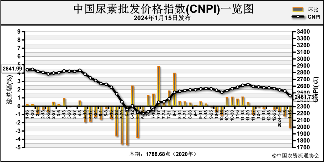 1月15日中国尿素批发价格指数(CNPI)为2461.73点,环比下跌69.42点,跌幅为2.74%;同比下跌380.26点,跌幅为13.38%;比基期上涨673.05点,涨幅为37.63%。