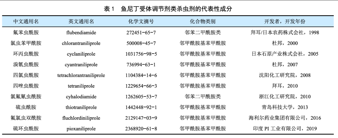 双酰胺类杀虫剂的研发始于 20 世纪 90 年代,凭借独特的作用机理、极高的生物活性、持久的药效,以及对哺乳动物极低的毒性和对非靶标生物的高度安全性(蜜蜂除外),上市后迅速受到市场的广泛关注,同时也极大地激发了全球农化企业的开发积极性。截至目前已获得 ISO 通用名并作用于害虫鱼尼丁受体的双酰胺类杀虫剂有十余种(表 1)。按化学结构差异可分为邻苯二甲酰胺类和邻甲酰胺基苯甲酰胺类,有别于传统作用于昆虫神经系统的有机磷、拟除虫菊酯、新烟碱等杀虫剂,这些化合物共同作用于昆虫肌肉系统的鱼尼丁受体上,引起脂质体上钙离子通道持续开放,造成钙离子流失,导致昆虫肌肉持续收缩,表现为快速停止取食、麻痹、拒食、回吐脱粪进而瘫痪死亡。双酰胺类杀虫剂作用机理独特,是害虫抗药性治理的有效工具之一,国际杀虫剂抗性行动委员会(IRAC)将其归类为 28 组。