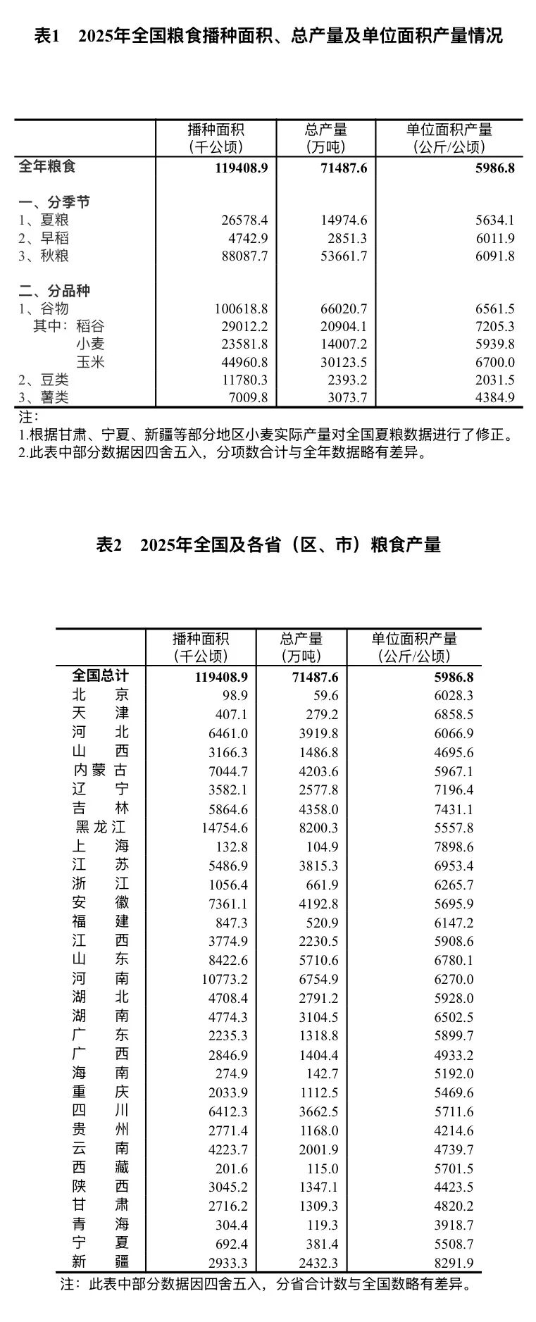 国家统计局关于2025年粮食产量数据的公告根据对全国31个省(区、市)的调查,2025年全国粮食播种面积、单位面积产量和总产量分别如下:一、全国粮食播种面积119409千公顷(179113万亩),比2024年增加90千公顷(135万亩),增长0.1%。其中谷物[1]播种面积100619千公顷(150928万亩),比2024年增加161千公顷(241万亩),增长0.2%。二、全国粮食单位面积产量59