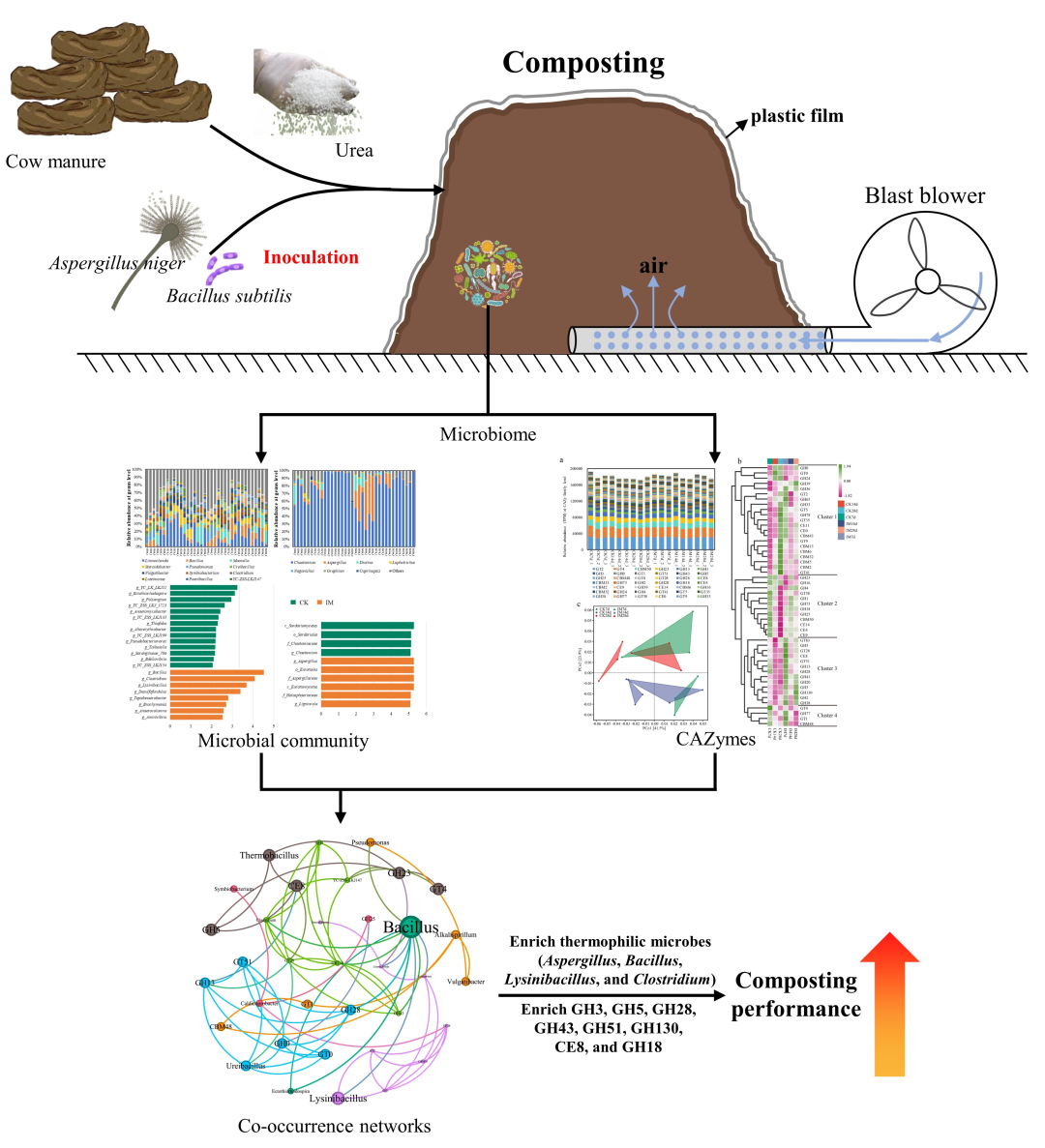 研究团队通过采用一种简单的有机物料腐熟剂(特殊筛选的黑曲霉和枯草芽孢杆菌)即可驱动和促进工业化的牛粪堆肥。该接种剂可加速堆肥温度的上升,使堆肥高温阶段的温度提高7~10 °C,延长整个堆肥过程中50 °C以上温度维持天数(由12天提升为26天),进而促进堆肥的成熟。通过扩增子测序和宏基因组测序,发现接种剂能促进曲霉属在堆肥升温阶段的富集,实现有机质的降解,为其他微生物提供基础代谢物,促进微生物群落多样性,并协同产生热量,使得堆体升温,启动整个堆肥过程。随着堆体温度不断上升,许多微生物因为不耐热而死亡。而简化接种剂中的耐热微生物(芽孢杆菌)接力在高温下存活发挥功能,与其他耐热微生物(如Clostridium和Lysinibacillus)合作,通过核心CAZymes (GH3、GH5、GH28、GH43、GH51、GH130、CE8和GH18)降解底物,并通过糖代谢途径持续产生热量,从而促进堆肥过程和堆肥成熟。