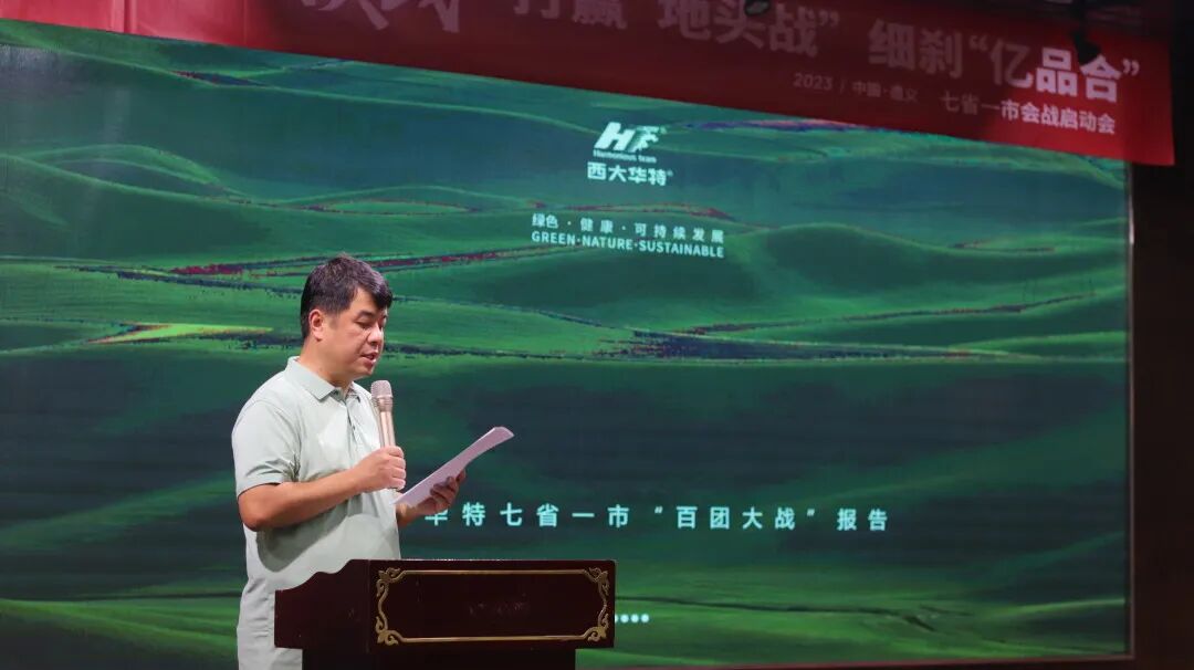 9月4日,西大华特在贵州遵义宾馆召开了“打赢地头战、细刹亿品合”的七省一市会战启动会。陕西西大华特科技实业有限公司董事长王鹏、高级营销教练梁耀琦、财务部总监屈诺东、行政人事中心主任张晶、市场部总监潘高峰、渠道一部总监陈明友、KA部总监尚裕春出席会议并讲话,各后台部门、省区做交流发言。