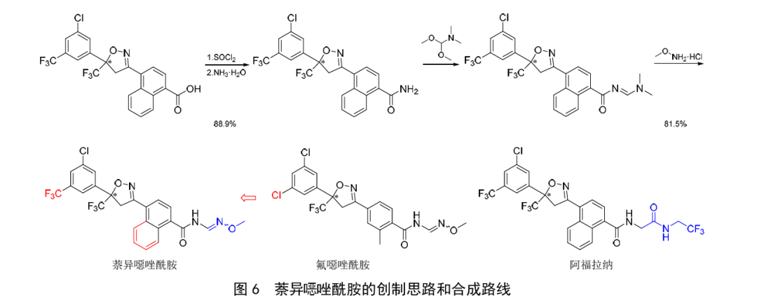 萘异噁唑酰胺是继唑氟虫胺后又一个英文通用名获ISO批准的异唑啉类中国创制杀虫剂,可视为对氟唑酰胺(fluxametamide)或阿福拉纳(afoxolaner)进行修饰而得到。推测萘异噁唑酰胺的作用机制与氟唑酰胺、氟雷拉纳和阿福拉纳类同,具有多种作用靶标,主要为γ−氨基丁酸门控氯离子通道变构调节剂。室内生测结果表明,萘异唑酰胺液管药膜法处理棕榈蓟马成虫的lc₅₀、lc₉₀(48h)分别为0.0123、0.0705mg/L,浸虫法处理无翅桃蚜的lc₅₀(48h)为0.4390mg/L。萘异噁唑酰胺可能的创制思路和合成路线见图6,合成可采用氟唑酰胺的合成路线并共用阿福拉纳的关键中间体。
