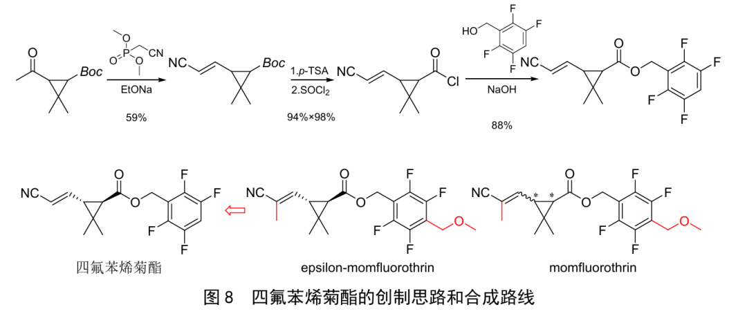 四氟苯烯菊酯是江苏扬农化工股份有限公司创制的新型卫生用杀虫剂,作用机制与其他拟除虫菊酯类杀虫剂类同,为钠离子通道抑制剂。室内生测结果(表3)表明,四氟苯烯菊酯外消旋体对蚊、蝇和德国小蠊等卫生害虫的击倒速度和杀虫活性均优于momfluorothrin和四氟醚菊酯(tetramethylfluthrin)。急性经口、经皮和吸入毒性测试结果表明,四氟苯烯菊酯对哺乳动物微毒。四氟苯烯菊酯为(Z)−式的(1R,3R)−对映体,可能的创制思路和合成路线见图8。四氟苯烯菊酯原药中可能还含有(Z)−式的(1S,3S)−对映体、(1S,3R)−对映体、(1R,3R)−对映体,以及(E)−式的(1R,3R)−对映体、(1S,3S)−对映体、(1S,3R)−对映体和(1R,3R)−对映体等7个对映异构体,可利用高效液相色谱对其中的四氟苯烯菊酯及其对映体进行分离和测定。