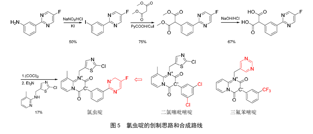 氯虫啶是青岛清原化合物有限公司继唑氟虫胺后创制的含介离子嘧啶鎓结构的新烟碱类杀虫剂,可视为对二氯噻吡嘧啶(dicloromezotiaz)的苯环取代基进行修饰而来(或对三氟苯嘧啶的3个芳环分别进行修饰而来),推测其作用机制与二氯噻吡嘧啶和三氟苯嘧啶类同,为烟碱乙酰胆碱受体(nAChR)拮抗剂。据报道,氯虫啶具有一定的内吸传导性、卓越的渗透能力和优异的环境友好特性,可高效防除对传统药剂产生抗性的二化螟和稻纵卷叶螟等鳞翅目害虫。室内生测结果表明,氯虫啶对二化螟3龄幼虫(0.2mg/L)、草地贪夜蛾2龄幼虫(1mg/L)、黏虫2龄幼虫(1mg/L)、斜纹夜蛾2龄幼虫(5mg/L)和稻飞虱(60mg/L)的48h杀死率分别为100%、70%、80%、90%和85%,与乙基多杀菌素、多杀霉素、甲氨基阿维菌素苯甲酸盐、阿维菌素、虱螨脲、虫螨腈、甲氧虫酰肼、高效氯氟氰菊酯、cybenzoxasulfyl、flupyrimin、氯虫苯甲酰胺、溴氰虫酰胺、茚虫威、毒死蜱、吡虫啉、噻虫嗪、敌敌畏、敌百虫、辛硫磷、三唑磷、喹硫磷、乙酰甲胺磷、丁硫克百威和二嗪磷等其他杀虫剂按一定比例混用对草地贪夜蛾、二化螟、黏虫和花生蚜等害虫防控具有协同增效作用。同时,氯虫啶对蜜蜂的急性接触和经口毒性LD50(96h)均>11μg/蜂,安全性优于三氟苯嘧啶(1μg/蜂的96h死亡率为90%)。氯虫啶可能的创制思路和合成路线见图5,合成可共用二氯噻吡嘧啶的关键中间体。