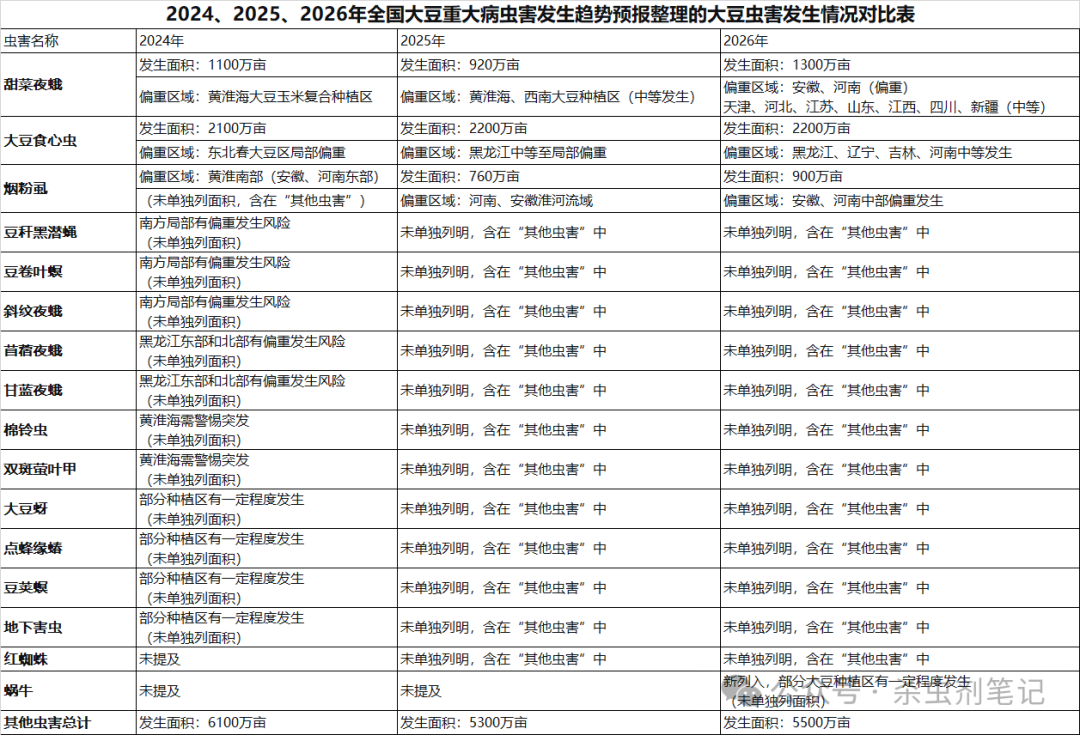 地里的大豆还没种下,病虫害的战书已经悄然下达。全国农技中心刚刚发布了2026年全国大豆重大病虫害发生趋势预报。翻阅近三年的预测报告,一组数据引人警觉:全国大豆病虫害发生面积从2024年的1.30亿亩次增至2026年的1.43亿亩次,呈现逐年上升趋势。作为关注农业植保的业内人士,我梳理了近三年的预测数据,发现一些不容忽视的变化正在悄然发生。01趋势延续翻开2024-2026年的预测报告,