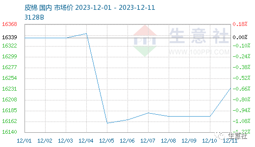 12月上旬,棉纺织市场供需基本面没有大的变化,新棉大量上市,消费总体依旧较弱但下游较前期有所好转,期货上涨明显,现货方面,据生意社商品行情分析系统,12月11日3128B级皮棉现货价格在16233元/吨,近日有小幅上涨。