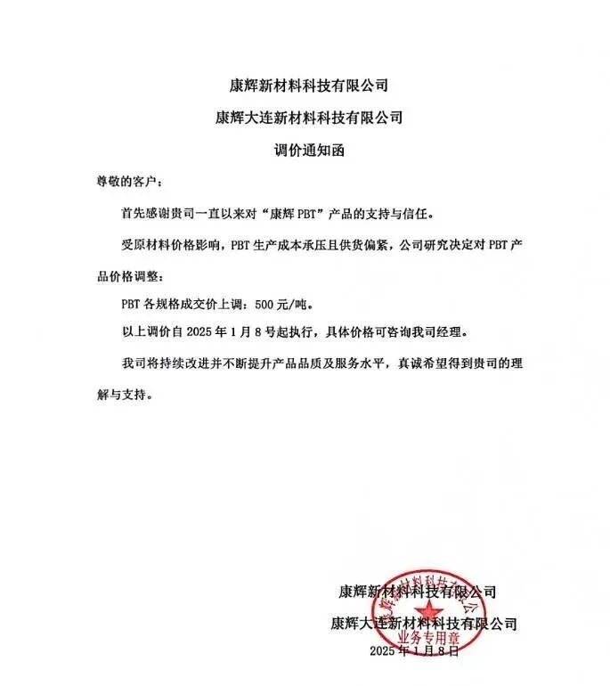 1月8日,康辉新材料科技有限公司、康辉大连新材料科技有限公司发布调价通知函称,由于生产成本承压,市场供货紧张,PBT明日起成交价上调500元/吨。