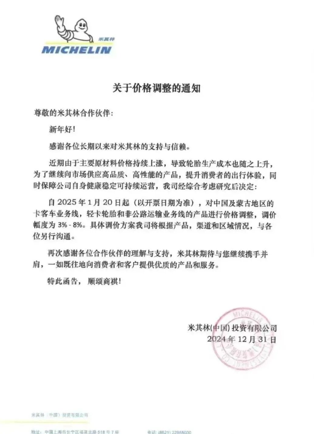 邓禄普轮胎宣布,自2025年1月1日起,其乘用车轮胎产品价格将整体上涨3%。德国马牌发布涨价通知,决定于2025年2月1日起调整产品买入价格,预期最大涨幅3%。米其林决定自2025年1月20日起 (以开票日期为准) ,对中国及蒙古地区的卡客车业务线,轻卡轮胎和非公路运输业务线的产品进行价格调整,调价幅度为3%-8%。▶▶芯片