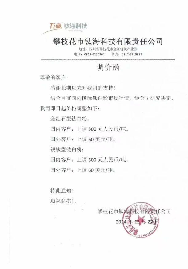 塞拉尼斯宣布从1月1日起,针对PBT/PET、PP、PA等产品进行调价,PBT/PET上调300-600美元/吨。(约合人民币2189-4379元/吨)云天化股份聚甲醛产品事业部发布调价函,对云天化共聚甲醛所有牌号价格上调500元/吨。立邦装饰材料(广州)有限公司发布产品调价函,决定从2025年1月1日开始对流通渠道的内墙乳胶漆进行价格上调,涨幅1%-3%左右。攀枝花市钛海科技有限责任公司发布调价函,国内金红石型及锐钛型钛白粉上调500元/吨,国外客户上调60美元/吨。 ▶▶新能源