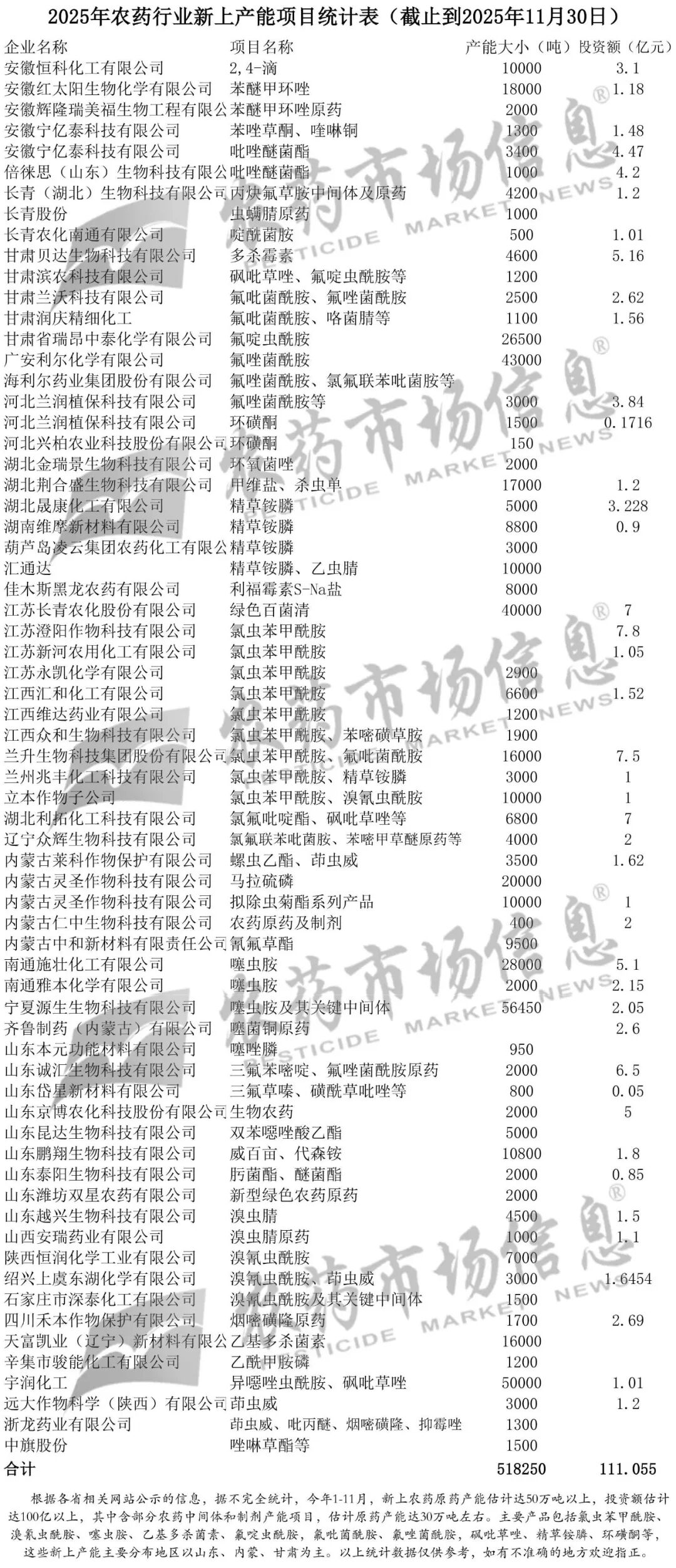 3. 企业新上产能项目仍然较火热,内卷现象仍然严重。据我们媒体对每周日发布的企业新上产能项目信息进行整理,据不完全统计,今年1-11月,新上农药原药产能达50万吨以上,投资达100亿以上,这其中含少量中间体和制剂的产能,预计原药产能也有30万吨左右,这里不排除有些公示数据虚夸或只是公示而没有进行实际投资建设。主要新上产品主要集中在氯虫苯甲酰胺、溴氰虫酰胺、噻虫胺、氟啶虫酰胺,氟吡菌酰胺、氟唑菌酰胺,砜吡草唑、精草铵膦、环磺酮等,主要地区以山东、内蒙、甘肃为主。据中国农药工业协会数据,2021年-2024年新增原药产能约为150万吨,平均每年约为30-40万吨,由此可见今年新上项目和产能并没有明显降低。有关2025年农药企业新上产能项目情况详见文章末尾我们媒体发布整理的统计表。