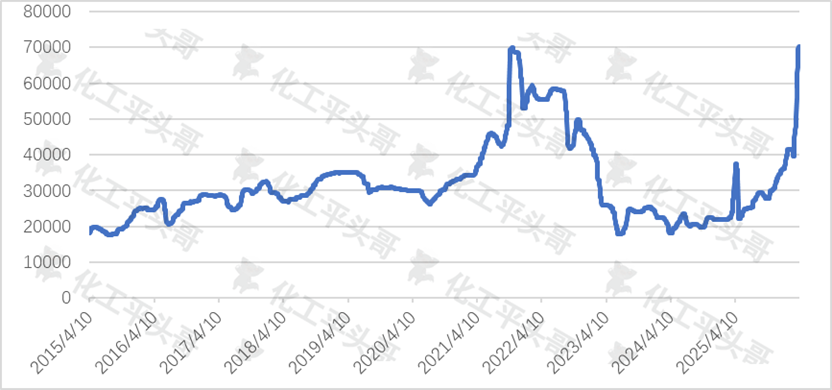 近一个月内,溴素价格出现了疯狂上涨,走势图中几乎呈现的是直线拉升状态。根据相关数据显示,截至2026年4月中旬,中国溴素市场主流价格已经突破7万元/吨,在短短一个月内上涨超过76%。