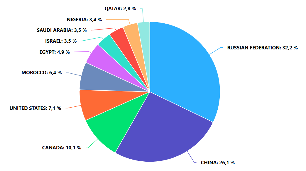 以下是巴西化肥进口最大10个原产国的细分,以及它们在巴西市场的份额。