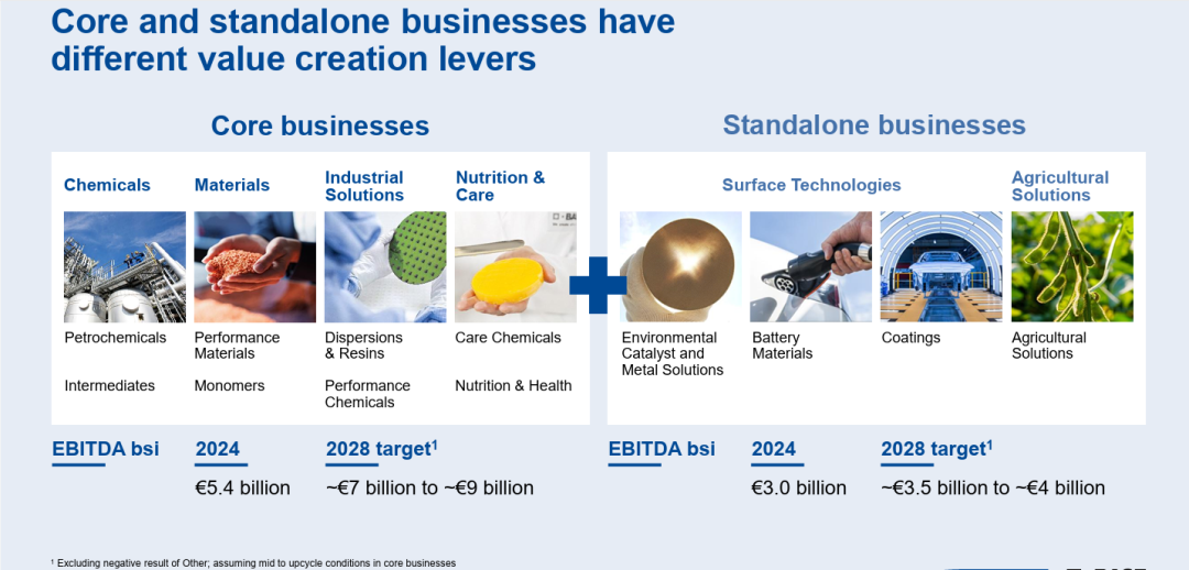 - 核心业务(化学品、材料、工业解决方案以及营养与护理业务领域):2024年EBITDA:54亿欧元;2028年目标:70–90亿欧元。