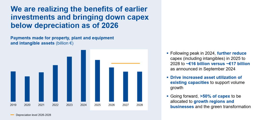 11月25日,巴斯夫在资本市场日演讲上表示,其正在收获前期投资的成果,并计划从2026年起将资本支出降至折旧以下:2025–2028年资本支出总额降至约160亿欧元(2024年9月公布为170亿欧元);提高现有产能利用率以支持销量增长;同时明确未来超过50%(超80亿欧元)的资本支出将用于增长地区、增长业务和绿色转型,并表示其目标是成为客户绿色转型的首选化工公司。
