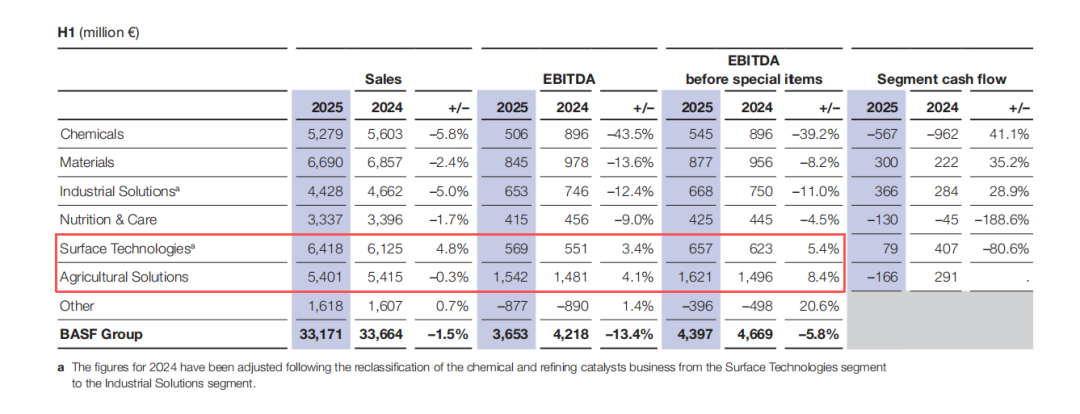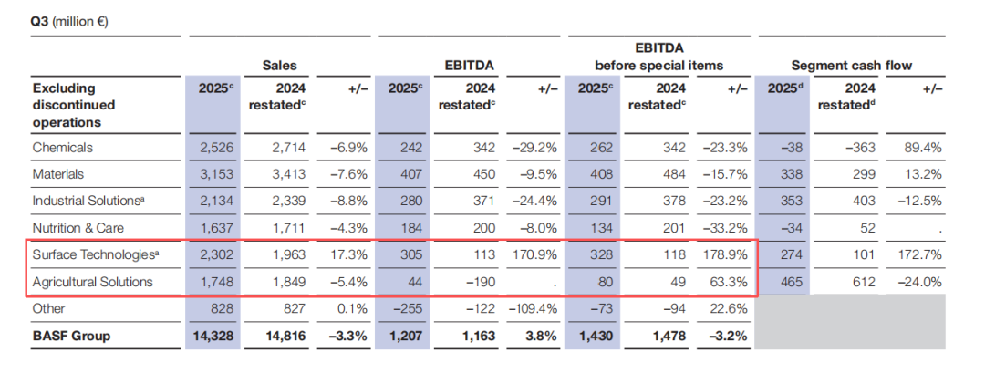 表面处理技术业务:巴斯夫2025年上半年销售额为64.18亿欧元,同比增长4.8%;不计特殊项目的EBITDA为6.57亿欧元,同比增长5.4%;第三季度销售额为23.02亿欧元,同比增长17.3%;不计特殊项目的EBITDA为3.28亿欧元,同比大涨178.9%。农业解决方案业务:2025年上半年销售额为54.01亿欧元,同比微降,不计特殊项目的EBITDA为16.21亿欧元,同比增长8.4%。第三季度销售额为17.48亿欧元,同比下降5.4%;不计特殊项目的EBITDA为8000万欧元,同比增长63.3%。然而其他业务的销售额与不计特殊项目的EBITDA均表现疲软,其中第三季度营养与护理业务不计特殊项目的EBITDA同比下降达33.2%。巴斯夫正在进行业务重构,剥离非核心,聚焦高价值赛道。涂料业务方面,2024年销售额43亿欧元,其中巴西装饰涂料业务上半年已卖给宣伟,其剩余的涂料业务也已与凯雷集团达成交易协议,预计2026年Q2完成,巴斯夫将保留40%股权,获得约58亿欧元税前现金。巴斯夫涂料,最终分拆出售!电池材料业务方面,2024年销售额6亿欧元,作为高增长赛道重点布局,巴斯夫已与宁德时代、国轩高科等签署协议,巴斯夫杉杉已成功向卫蓝新能源交付首批用于半固态电池的量产正极材料。