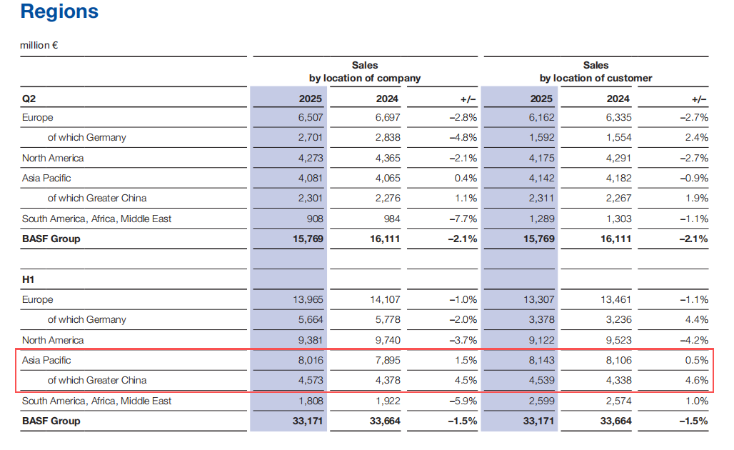 近期巴斯夫又签约多家企业,通过技术突破与跨界合作,构建多维度低碳转型路径:产业链协同合作方面,巴斯夫与中国石化天然气分公司、扬子石化—巴斯夫于11月26日签约合作,中国石化天然气分公司将为扬子石化—巴斯夫南京一体化基地提供ISCC+认证生物天然气及碳足迹数据,助力基地低碳转型,降低产品碳足迹,双方还积极探索将生物天然气拓展至巴斯夫其他基地。11月17日,巴斯夫(中国)有限公司与四川正达凯新材料有限公司签约,双方将围绕天然气精细化工、塑料循环科技等方面展开深度合作,合力推进产业链绿色转型。另外,在低碳技术方面,巴斯夫和埃克森美孚于11月17日签约合作决定共同开发甲烷热解技术,建设示范工厂,推动低碳氢商业化,该技术用电将天然气转化为氢和固态碳,无二氧化碳排放,耗电仅为电解水制氢的五分之一,为工业提供高效低碳解决方案。从业绩方面来看,2025年前三季度,巴斯夫全球主要市场呈现显著分化,唯有亚太地区(特别是中国市场)的销售额实现了同比增长,而其他地区仅有欧洲地区第三季度的销售额实现同比微增,其余均实现同比下降。具体来看: