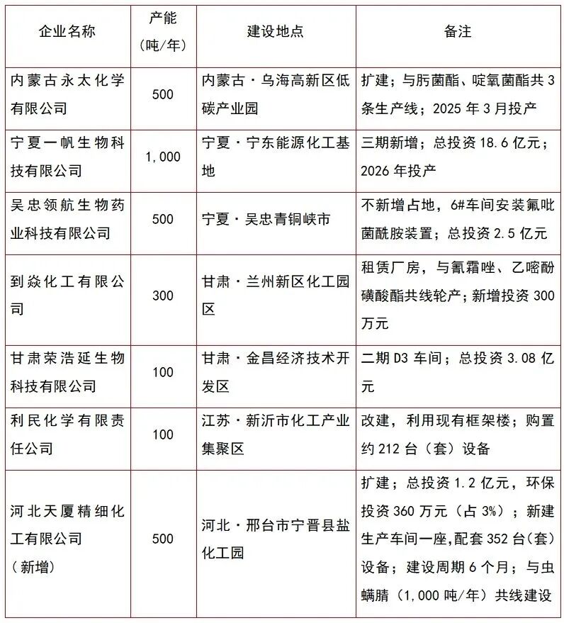 产能汇总:7家企业规划原药产能合计约 3,000吨/年。宁夏地区1,500吨/年(最大);内蒙古500吨/年;甘肃400吨/年;河北500吨/年(新入局);江苏100吨/年。