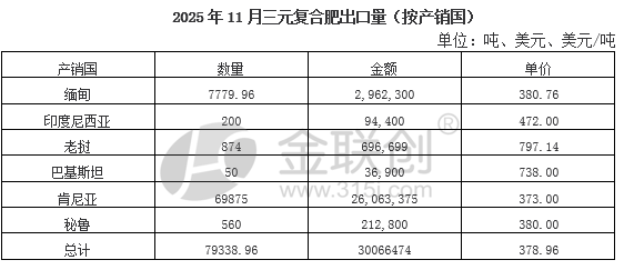 2025年11月出口三元复合肥7.93万吨,与10月份相比下降19.24%。11月份出口金额3006.64万美元,均价378.96美元/吨,与10月相比上涨0.18%。