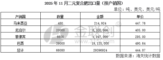 据海关统计数据显示:2025年11月出口二元复合肥6.61万吨,与10月相比下降32.96%。11月份出口金额2939.69万美元,均价444.87美元/吨,与10月相比上涨15.45%。