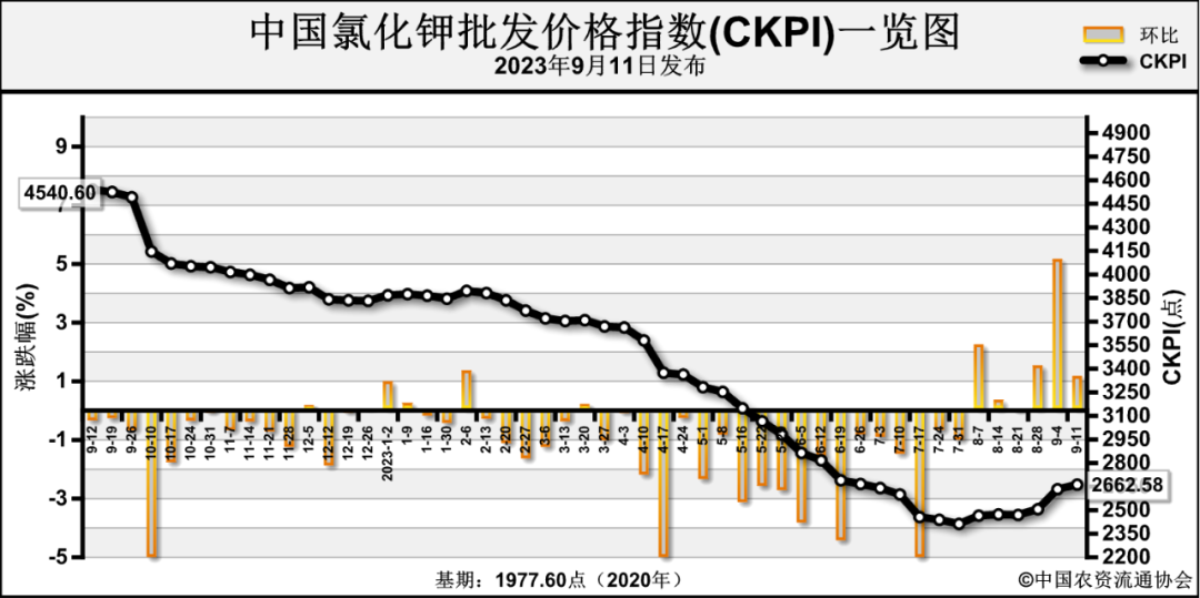 9月11日中国氯化钾批发价格指数(CKPI)为2662.58点,环比上涨29.25点,涨幅为1.11%;同比下跌1878.02点,跌幅为41.36%;比基期上涨684.98点,涨幅为34.64%。
