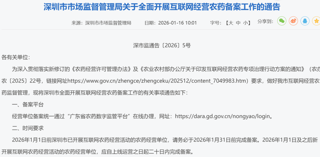 1月16日,深圳市市场监督管理局发布通告,自即日起全面开展互联网经营农药备案工作。所有在深圳市从事互联网农药经营的单位,均须通过“广东省农药数字监管平台”进行备案,并明确规定了备案时限与具体要求,监管部门将严查无证经营、未及时备案等违规行为。