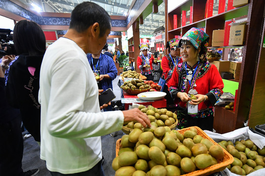 在农博会现场,湘西蔬果展区的参展商向参观者介绍猕猴桃。 新华社记者 陈泽国 摄