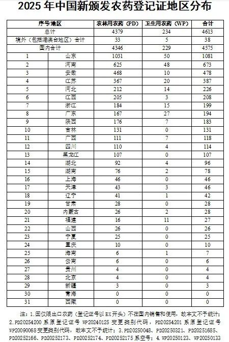 山东第一,河南第二!2025年中国新颁发农药登记证地区分布