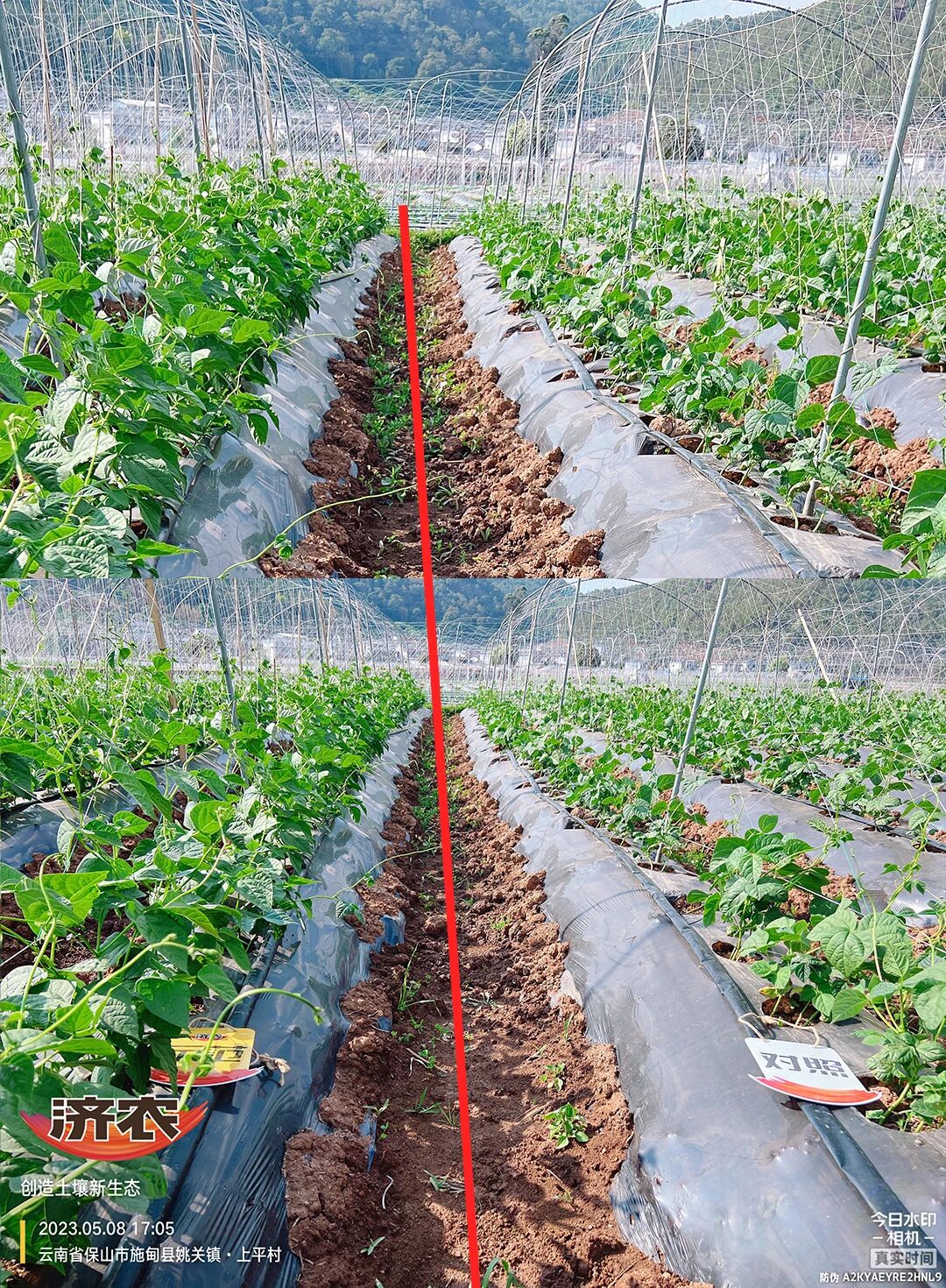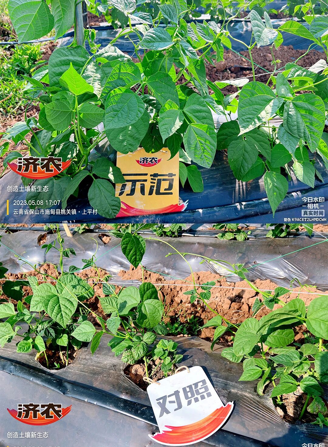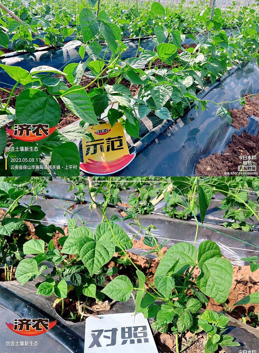 2023年4月5日,位于云南省保山市施甸县姚关镇山邑村的杨大哥开始今年的扁豆种植。在第15天用肥的时候,鼎天济农市场服务经理与昌宁县湾甸乡惠田植保农资店技术人员一同前往,开始了今年的配方施肥。使用济农乐土1L/亩+济农大嘴根1L/亩+微生物菌剂灌根,间隔10天再次使用济农乐土1L/亩+复合肥2kg/亩。5月8日回访,效果一目了然,使用“济农乐土+”的扁豆苗生长速度快,叶片肥厚宽大,颜色浓绿,且抗病
