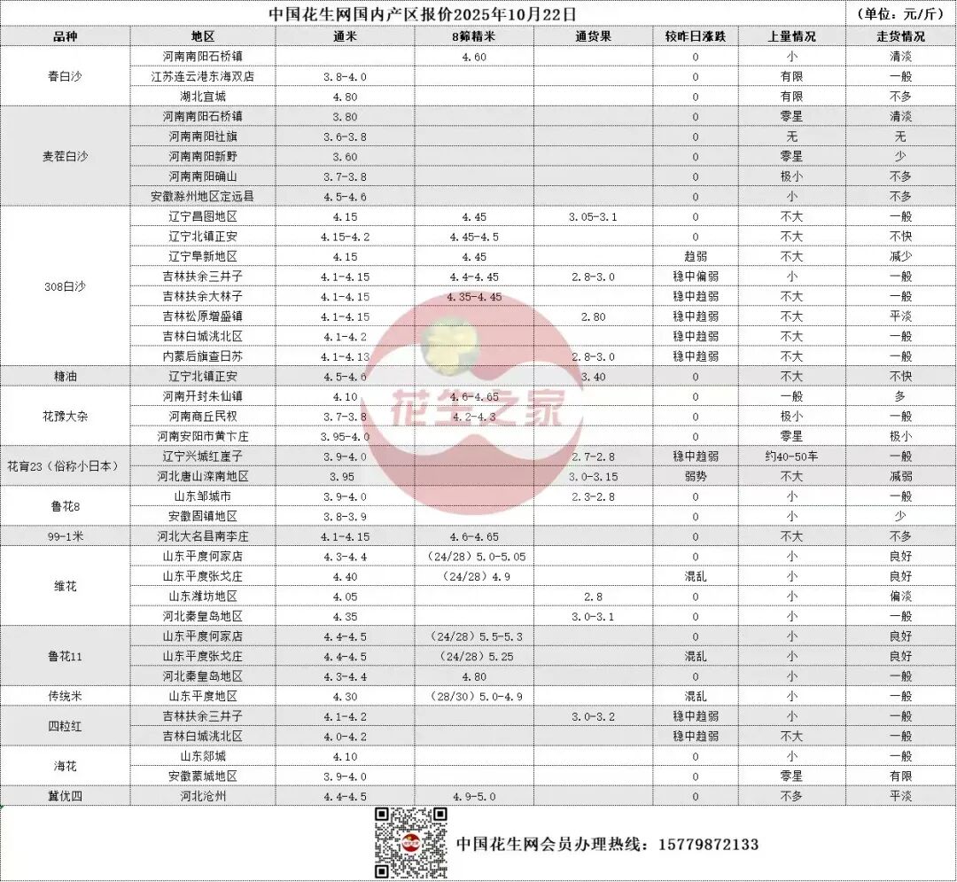 辽宁产区兴城红崖子花育23(俗称小日本)通货米收3.9-4.0左右,个别好货4.02左右;昌图古榆地区308白沙通货米收4.15左右,8个筛精选米4.45左右,通货果3.05-3.1左右,色选果3.8左右,趴拉颗色选果3.9-4.0左右;北镇正安地区308白沙通货米4.15-4.2左右,8个筛精选米4.45-4.5左右,瓣米4.1左右,糖油通米收4.5-4.6左右;购销主体观望情绪略显,小贩收购积极性有所减弱,上货量不大,市场要货的少,成品交易缓慢,价格稳中趋弱,以质论价为主;