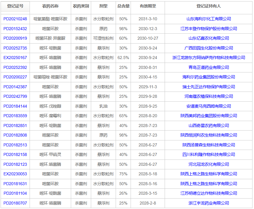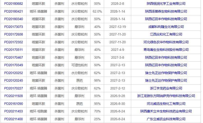 中国登记情况:截至2021年7月,共有28个正式登记产品,包括原药(98%含量)、单剂(50%水分散粒剂、30%悬浮剂)及复配制剂(如与咯菌腈、苯醚甲环唑复配)。江苏丰登作物保护股份有限公司2015年获首家98%原药登记,利民化工等企业随后跟进。主要用于葡萄灰霉病、水稻稻瘟病、大麦种衣剂等,复配产品多针对抗性管理(如与三唑类无交互抗性)。